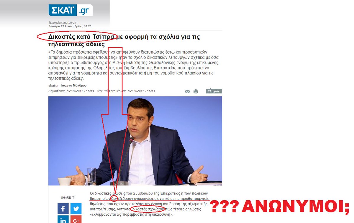 υσ.: Ο σύριζα -αμέσως!- κατάφερε να έχει δικούς του, φανατικούς, ΚΑΙ στον χώρο της δικαιοσύνης, από ανώτατα κλιμάκια (βλ.Θάνου), από ιδεοληπτικούς μεγαλύτερης ηλικίας (κολλημένους στις αριστερές θεωρίες των νιάτων τους, αυτοί ειδικά δεν έχουν και χρόνο για να σκέφτονται οτιδήποτε άλλο εκτός απ΄τη δουλειά τους, είναι χειρότεροι ακόμα κι απ΄τους καλλιτέχνες), μέχρι φρεσκοδιορισμένα δικαστάκια που φοβούνται μη χάσουν προνόμια απ΄το δημοσιοϋπαλληλίκι τους. Γι΄αυτό άλλωστε και δεν μπορούμε -επί σύριζα- να μιλάμε για αδιάβλητη δικαιοσύνη…
