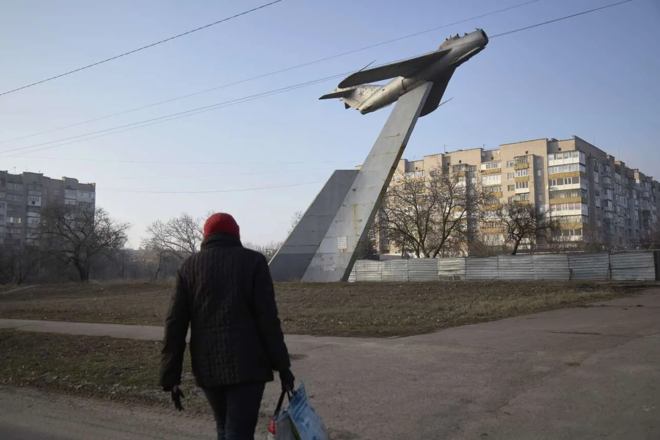 BERDYANSK, UKRAINE - FEBRUARY 16: A local resident walks near a Soviet monument on February 16, 2022 in Berdyansk, Ukraine. Russian forces are conducting large-scale military exercises in Belarus, across Ukraine's northern border, amid a tense diplomatic standoff between Russia and Ukraine's Western allies. Ukraine has warned that it is virtually encircled, with Russian troops massed on its northern, eastern and southern borders. The United States and other NATO countries have issued urgent alerts about a potential Russian invasion, hoping to deter Vladimir Putin by exposing his plans, while trying to negotiate a diplomatic solution. (Photo by Pierre Crom/Getty Images)
