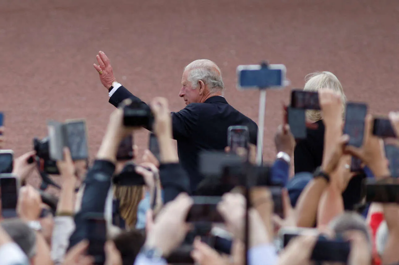 Ο Κάρολος Γ’, επιστρέφοντας από το Μπαλμόραλ της Σκωτίας μαζί με τη σύζυγό του Καμίλα, κατέβηκε από το αυτοκίνητο υπό τις επευφημίες του πλήθους που άρχισε να τραγουδάει τον ύμνο «Ο Θεός σώζει τον βασιλιά». Ένας από τους παρευρισκόμενους φώναξε μάλιστα «Σ’ αγαπάμε, Κάρολε». Στη συνέχεια προχώρησε προς τις πύλες και είδε τα αμέτρητα μπουκέτα που είχαν αφήσει στα κάγκελα των Ανακτόρων Λονδρέζοι και τουρίστες.